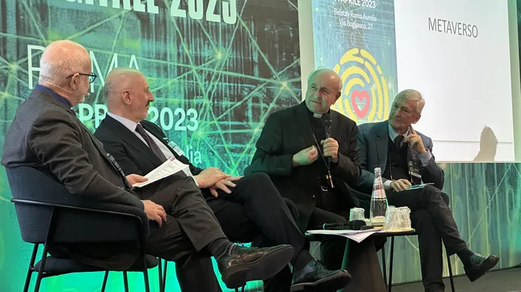 Nella foto da Sinistra a Destra: Fabrizio Ammirati, Massimo Massetti, Mons. Vincenzo Paglia e Claudio Santini. Foto scattata durante la sessione su "Digitale e Etica" delle ore 10:45 di stamane. Nella foto da Sinistra a Destra: Fabrizio Ammirati, Massimo Massetti, Mons. Vincenzo Paglia e Claudio Santini. Foto scattata durante la sessione su "Digitale e Etica" delle ore 10:45 di stamane.